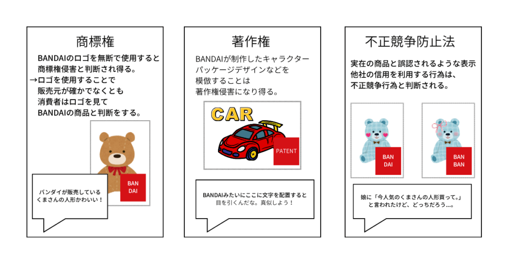 著作権:たとえば既存のパッケージデザインやキャラクターの意匠を模倣・再構築された場合、著作権侵害と見なされる可能性があります。