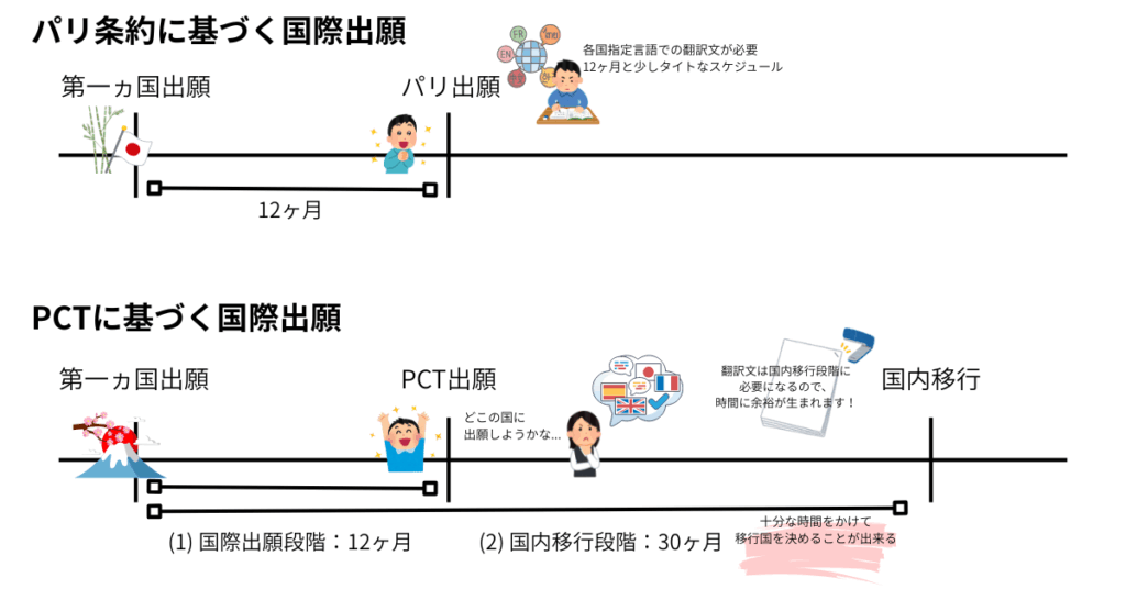 この方式では、各国の特許庁へ直接出願手続きを行う必要があるため、12か月以内に翻訳文の準備を完了させる必要があります。